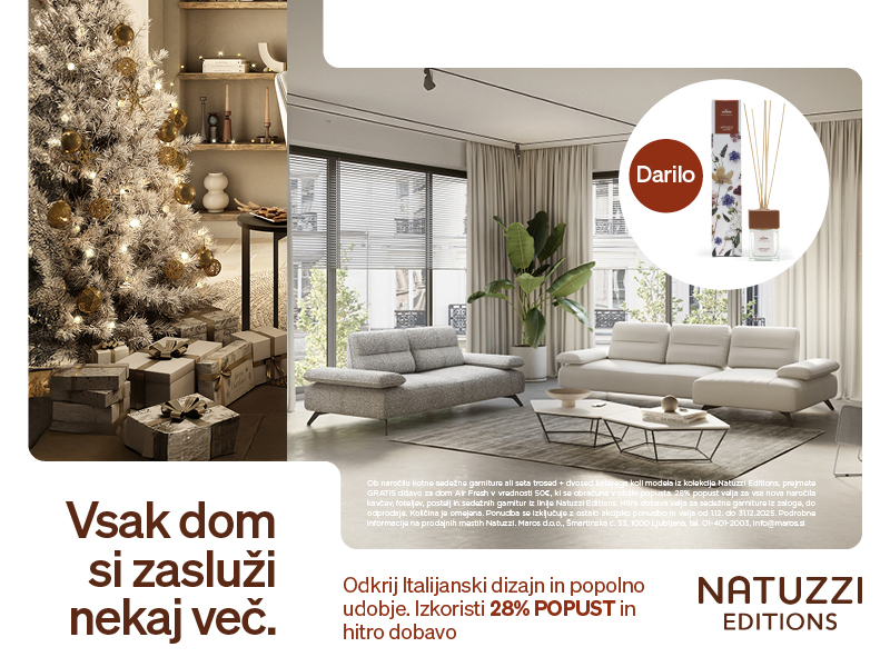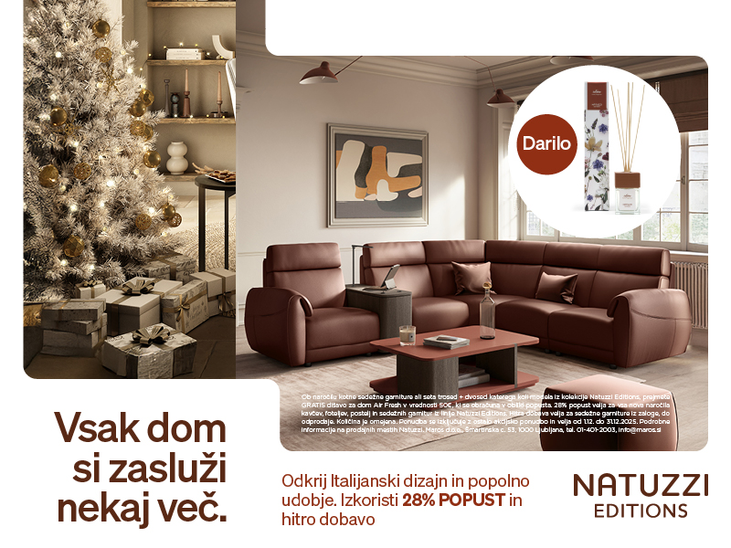 Ob naročilu kotne sedežne garniture, kavča, postelje ali počivalnika katerega koli modela iz kolekcije Natuzzi Editions, prejmete GRATIS dišavo za dom Air Fresh v vrednosti 50€, ki se obračuna v obliki popusta. 28% popust velja za vsa nova naročila kavčev, foteljev, postelj in sedežnih garnitur iz linije Natuzzi Editions. Hitra dobava velja za sedežne garniture iz zaloge, do odprodaje. Količina je omejena. Ponudba se izključuje z ostalo akcijsko ponudbo in velja od 1.12. do 31.12.2025. Podrobne informacije na prodajnih mestih Natuzzi. Maros d.o.o., Šmartinska c. 53, 1000 Ljubljana, tel. 01-401-2003, info@maros.si