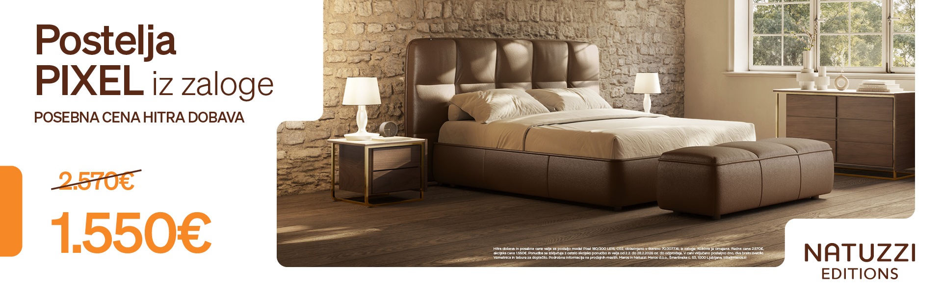 Pixel je postelja mehkih in zapeljivih oblik, ki te osvoji na prvi pogled. Zaobljene linije vzglavja in celotnega posteljnega okvirja objemajo vzmetnico za dobro spanje in za trenutke sprostitve ali udobnega branja. Pixel je izjemno vsestranski in inovativen model postelje, pri katerem lahko sprostite svojo kreativnost pri izbiri različnih kombinacij prevlek med usnjem in tkanino z možnostjo kontrastne obrobe (piping). Več o postelji Pixel TUKAJ.