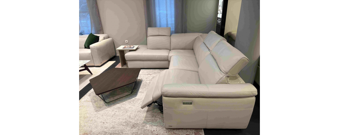ODPRODAJA SE: Kotna sedežna garnitura Curioso z dvižnimi nasloni za glavo in električnim počivalnikom na desnem dvosedu. Garnitura je tapecirana v vrhunsko Natuzzi usnje v svetlo sivo - bež barvi.